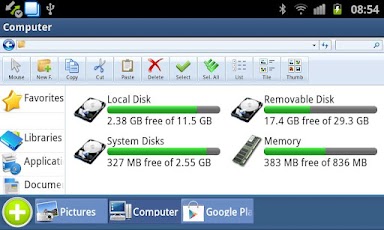 Mendukung tab, sehingga Anda dapat membuka beberapa folder pada saat yang sama. Ini juga merupakan tugas manajer memungkinkan beralih ke programms lain yang telah dibuka, atau menutup atau menghapus mereka. Aplikasi diluncurkan juga di taskbar. Ada juga alternatif untuk tombol Start Menu: link Aplikasi di menu samping akan menampilkan semua aplikasi yang terinstal.